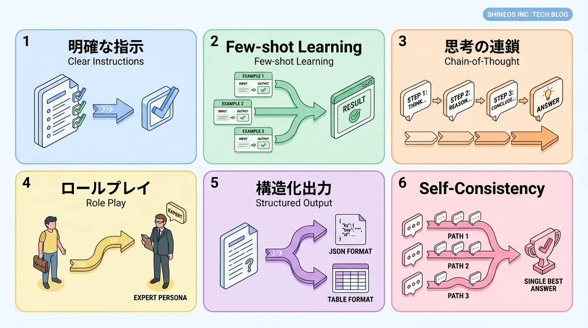 プロンプトエンジニアリングの主要テクニックと適用シーンを以下にまとめます。