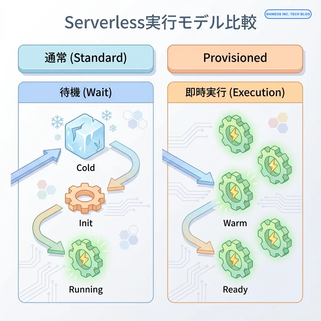 | 対策2:構成設定 | Provisioned Concurrency(AWS)、メモリ割り当て増 | 金銭的コストとのトレードオフで検討。 |