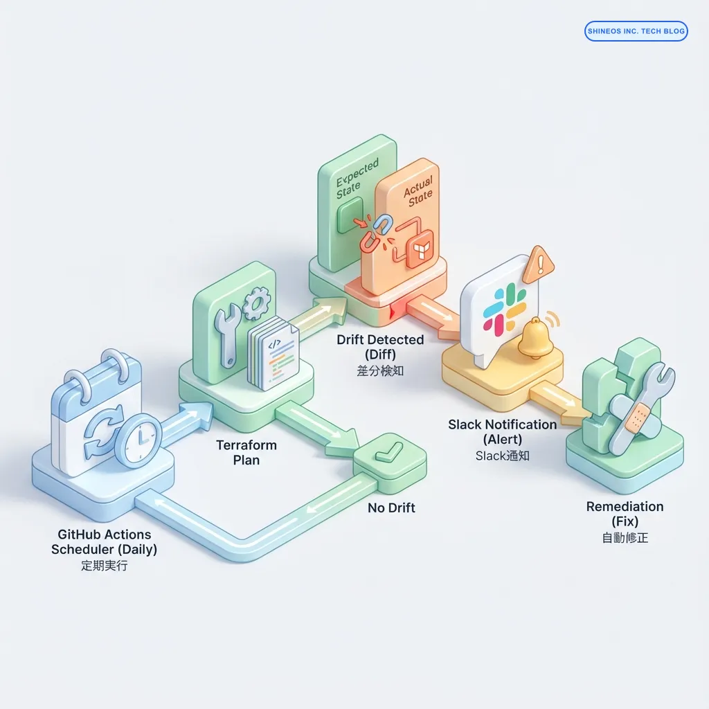 • 定期的なDrift Detection: GitHub Actionsで毎日 terraform plan を実行し、差分を通知する。